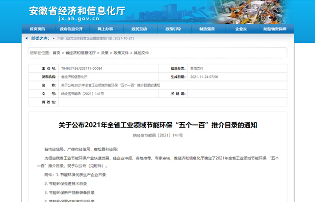 Sludge Carbonization for Biofuel listed in Anhui's "Five 100" Energy-saving & Eco-friendly Advanced Technologies in 2021.