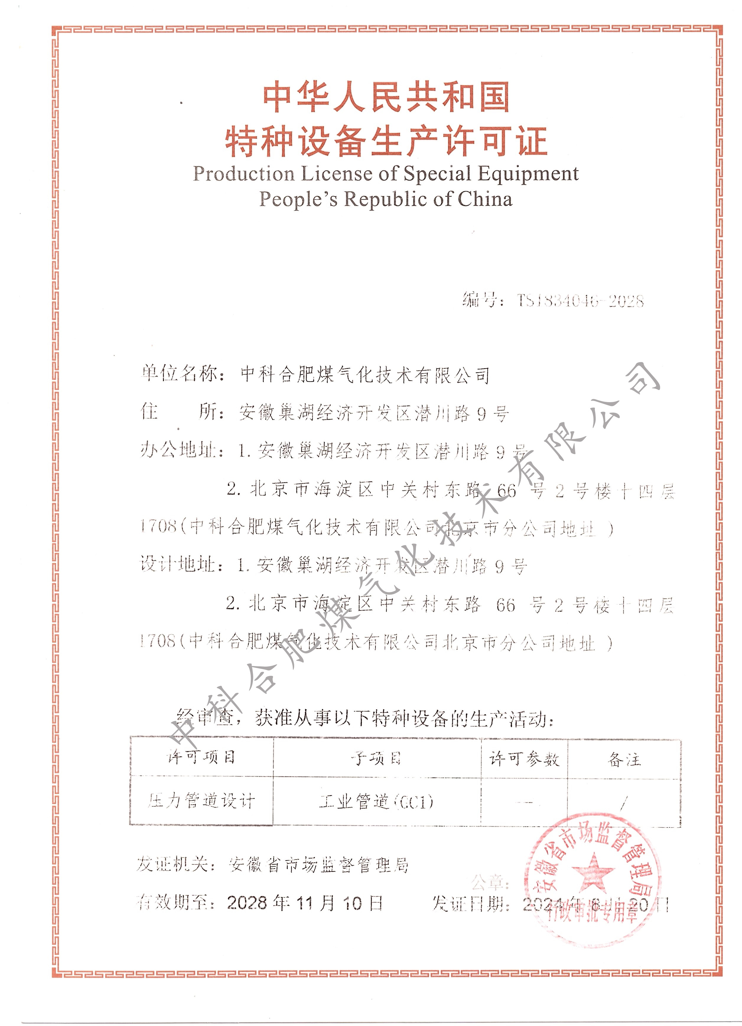 Special Equipment Production License (GC1 Pressure Piping Design)