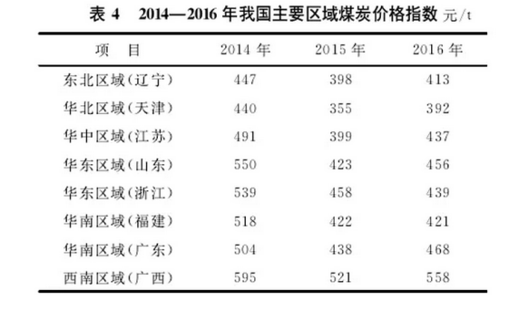 2016年12月各省(區(qū)、市)非居民用天然氣基準(zhǔn)門站價(jià)格(含增值稅)見(jiàn)表3,2014—2016年我國(guó)主要區(qū)域煤炭?jī)r(jià)格指數(shù)見(jiàn)表4。天然氣和煤炭?jī)煞N資源價(jià)格有明顯的地域性,主要分為華東和華南、華北、西北地區(qū)。其中華東和華南地區(qū)遠(yuǎn)離天然氣主產(chǎn)區(qū),無(wú)論是管輸還是LNG運(yùn)輸,均存在成本高的問(wèn)題,目前售價(jià)在2.5元/m3以上,而煤炭限制少,可依托海運(yùn)優(yōu)勢(shì)實(shí)施進(jìn)口,售價(jià)與國(guó)內(nèi)運(yùn)輸價(jià)環(huán)渤海灣指數(shù)基本相同。華北地區(qū)天然氣靠近資源產(chǎn)地和國(guó)家主進(jìn)口管道,資源可獲得性較好,氣價(jià)相對(duì)較低,目前售價(jià)2元/m3左右。煤炭雖也靠近產(chǎn)地,但基本以鐵路和公路運(yùn)輸為主,物流費(fèi)用較高,售價(jià)與國(guó)家環(huán)渤海灣指數(shù)相同。同時(shí),京津冀地區(qū)環(huán)保壓力大,壓縮煤炭數(shù)量指標(biāo)高。西北地區(qū)位于天然氣和煤炭主產(chǎn)地,售價(jià)較低。