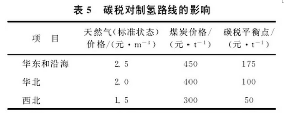 以2015年上海地區(qū)天然氣價(jià)格2.5元/m3、煤炭?jī)r(jià)格450元/t測(cè)算,當(dāng)碳稅為175元/t時(shí),采取煤制氫工藝相對(duì)于天然氣制氫工藝,在成本上失去優(yōu)勢(shì)。以華北地區(qū)天然氣價(jià)格2.0元/m3、煤炭?jī)r(jià)格450元/t為基準(zhǔn),當(dāng)碳稅為100元/t時(shí),采取煤制氫工藝相對(duì)于天然氣制氫工藝,在成本上失去優(yōu)勢(shì)。以西北地區(qū)天然氣價(jià)格1.5元/m3、煤炭?jī)r(jià)格300元/t為基準(zhǔn),當(dāng)碳稅為50元/t時(shí),采取煤制氫工藝相對(duì)于天然氣制氫工藝,在成本上失去優(yōu)勢(shì)。