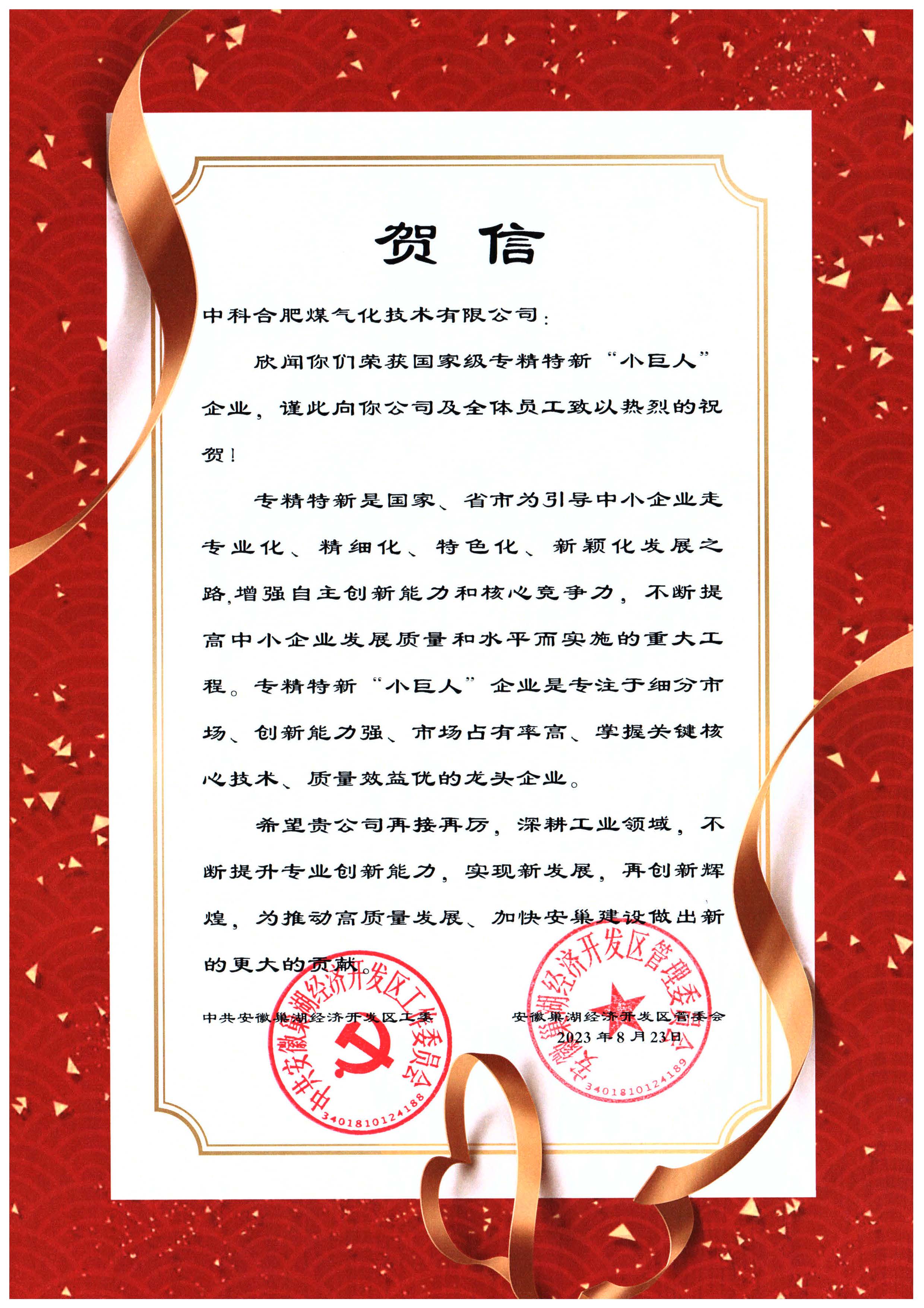 近日,第五批國家專精特新“小巨人”企業名單出爐,中科合肥煤氣化技術有限公司(以下簡稱“中合氣化”)通過市、省、工信部逐級評審后,最終榮獲工信部授予的第五批國家級專精特新“小巨人”稱號!這是中合氣化繼2020年榮獲省級和市級“專精特新中小企業”的又一重要里程碑,公司的專業水平與創新能力得到進一步認可。