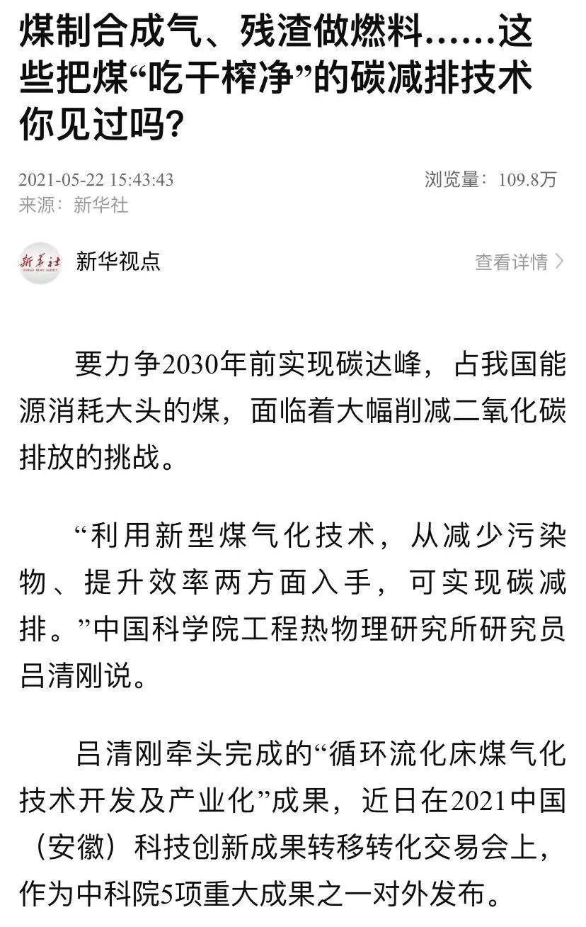 5月,新華社發(fā)布報道《煤制合成氣、殘渣做燃料……這些把煤“吃干榨凈”的碳減排技術(shù)你見過嗎?》,點擊閱讀量破百萬。